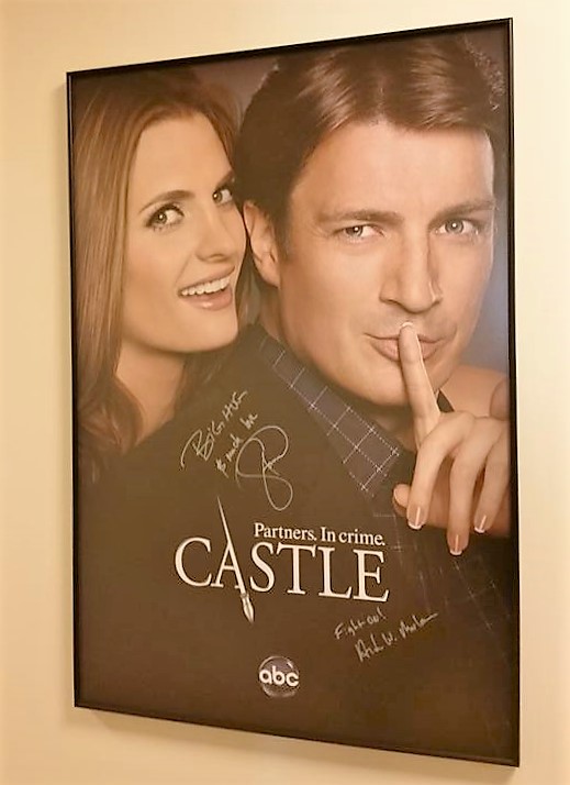 Framed poster of Stana Katic & Nathan Fillion of Castle hanging in the School of Cinematic Arts Building at the University of Southern California. |