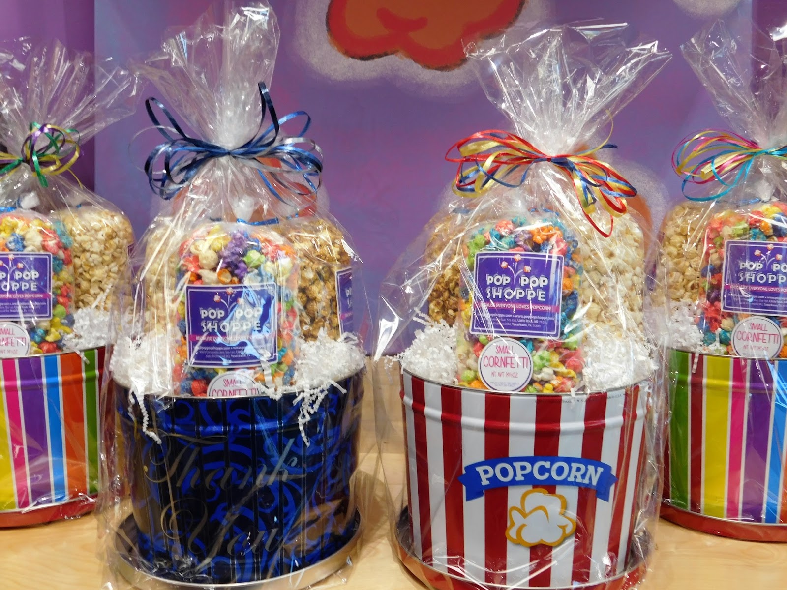 There are more than 25 flavors of Pop Pop Shoppe popcorn available, ranging from plain butter to spicy Cajun and from sweet Wedding Cake to fruit Cherry, Blueberry, Banana or Grape. You can purchase everything from an individual serving of fresh popcorn to gift baskets featuring different types of popcorn in colorful or holiday themed tins.