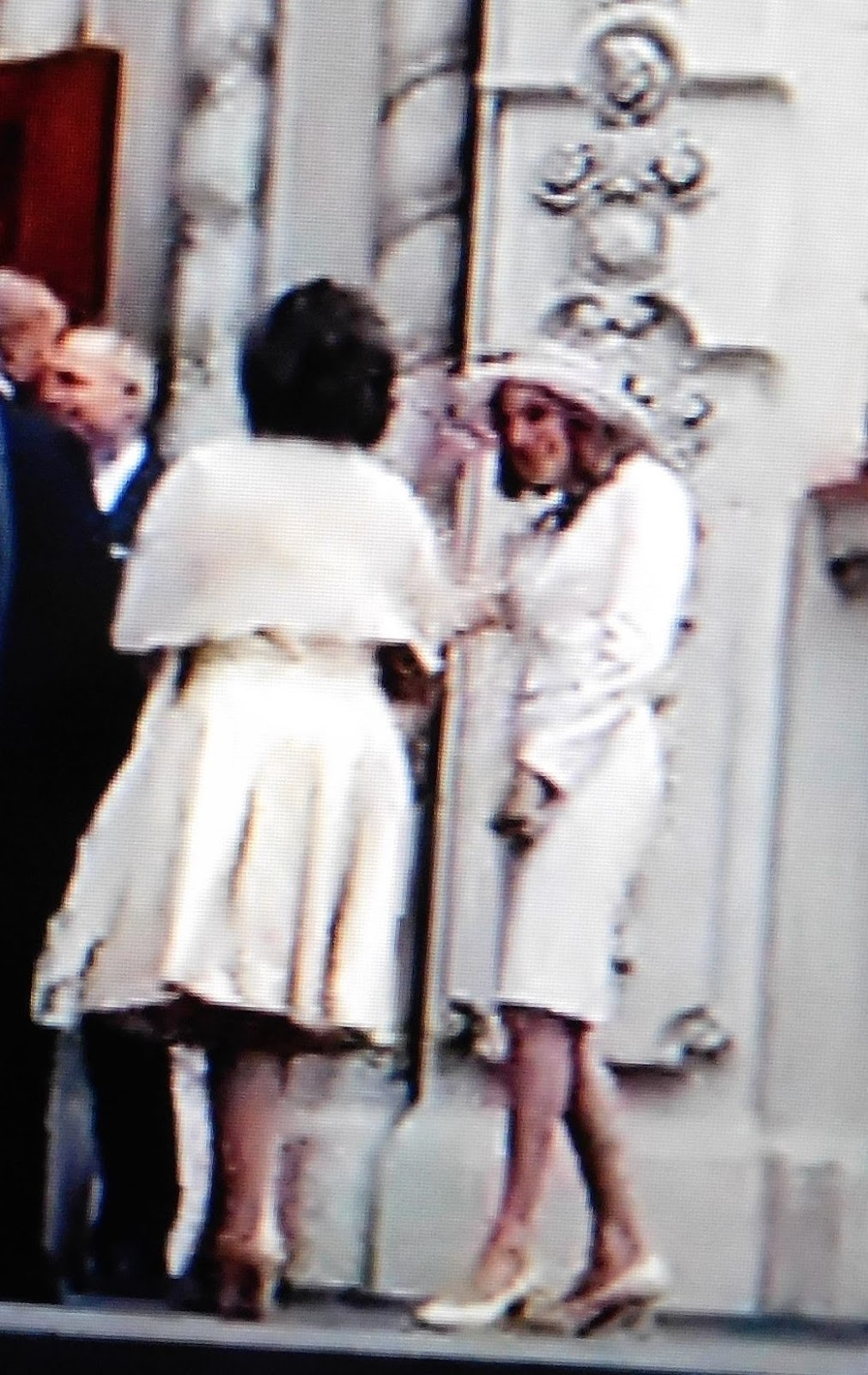 | I’m wearing a beautiful pink suit and pink hat standing near the entrance of the church in this photo from Episode 100. |